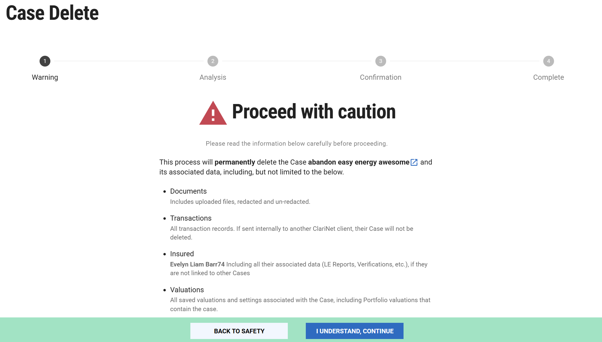 - Warning - The first page confirms the Case you’ve selected and reminds you of the types of data that may be deleted.