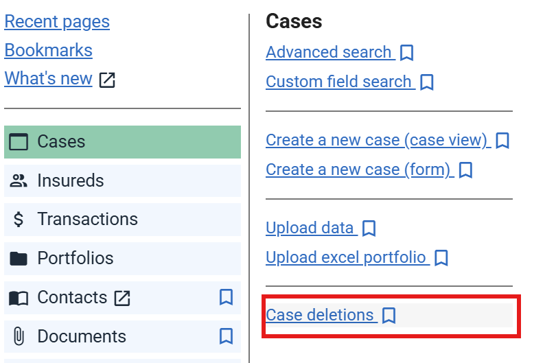 Permanent Case deletions are not recorded in the standard audit log. Instead, they appear on the Case Deletions page. Subscriber admins can access this page using the menu shown below.