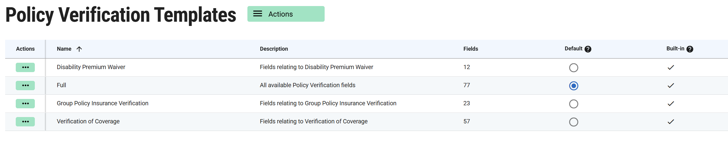 By default, the Full template is selected. It includes all ~80 available fields. If you previously used the Policy Verification Defaults feature, your existing settings will be migrated into a Custom template, which becomes your default and can be edited freely. Whenever you create a new Policy Verification, your default template is automatically pre‑selected.