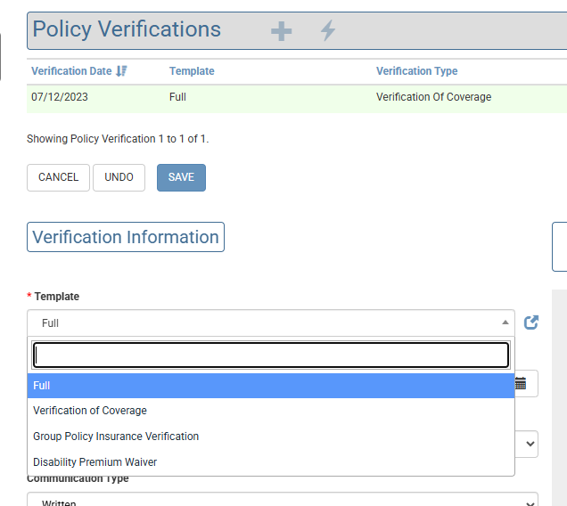 - Copied from previous – the system looks at the most recent Policy Verification (chronologically) and copies the value from that field into the current one