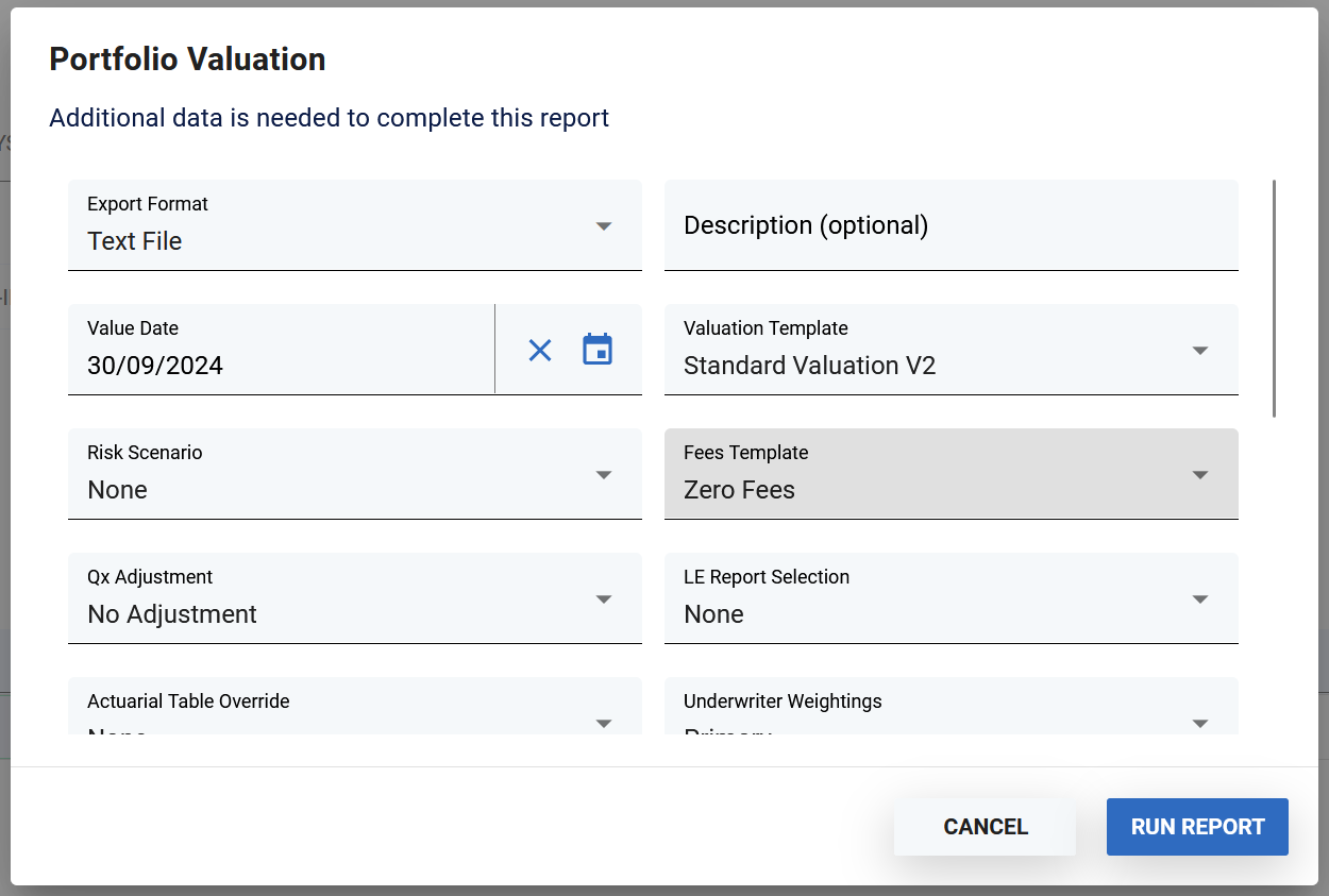 Click the “RUN REPORT” button and a valuation will be generated and the export template populated from the results. The valuation will not be saved.