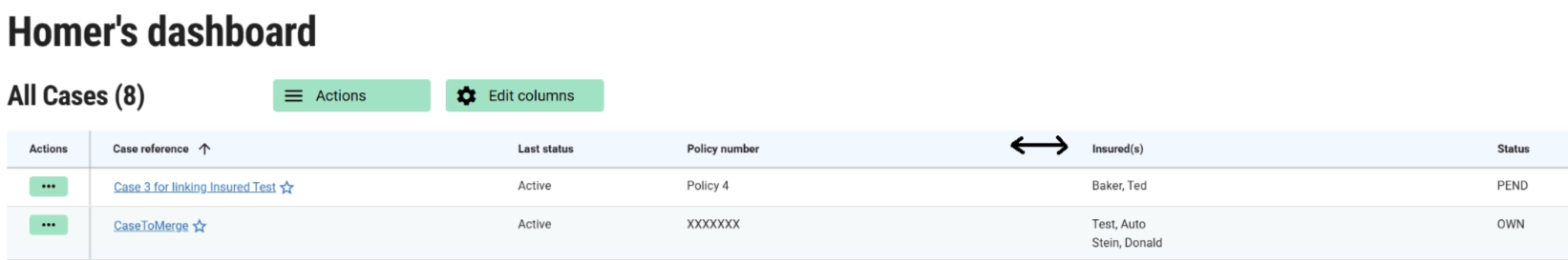 Once a column is shown on the Case List, you can further customize it by dragging it out of the grid to remove it, or resizing it by hovering at the right-hand edge of the column header until the cursor changes to a sizer icon. Then left-click and hold to adjust the size of the column.