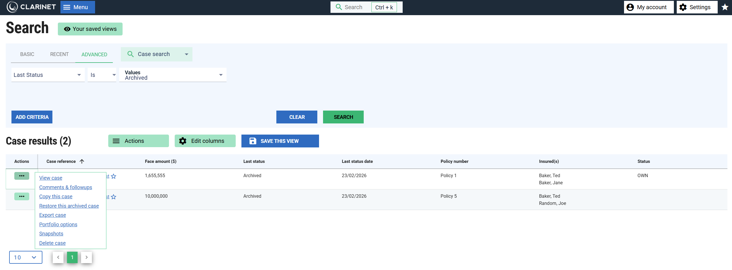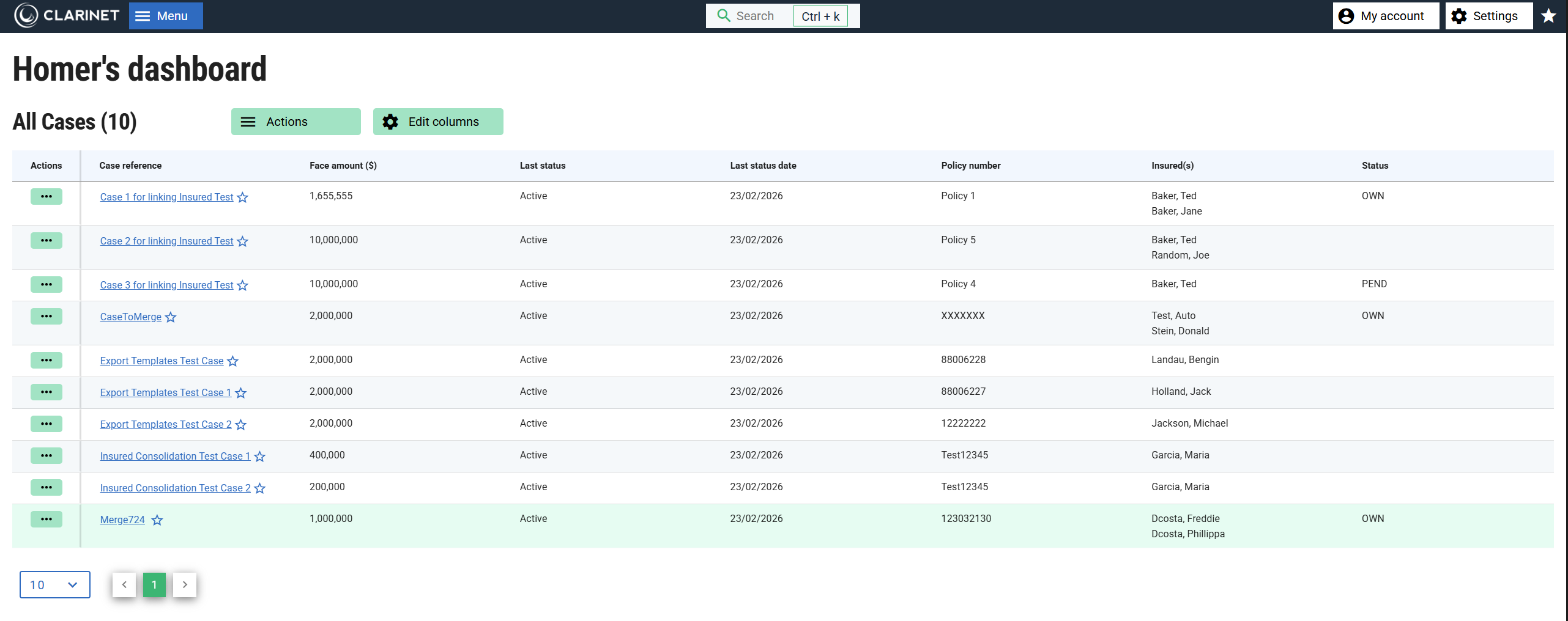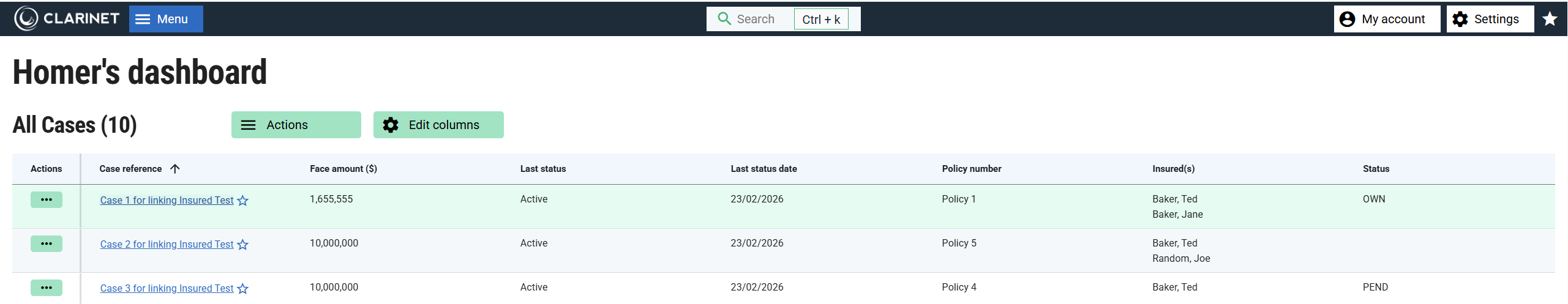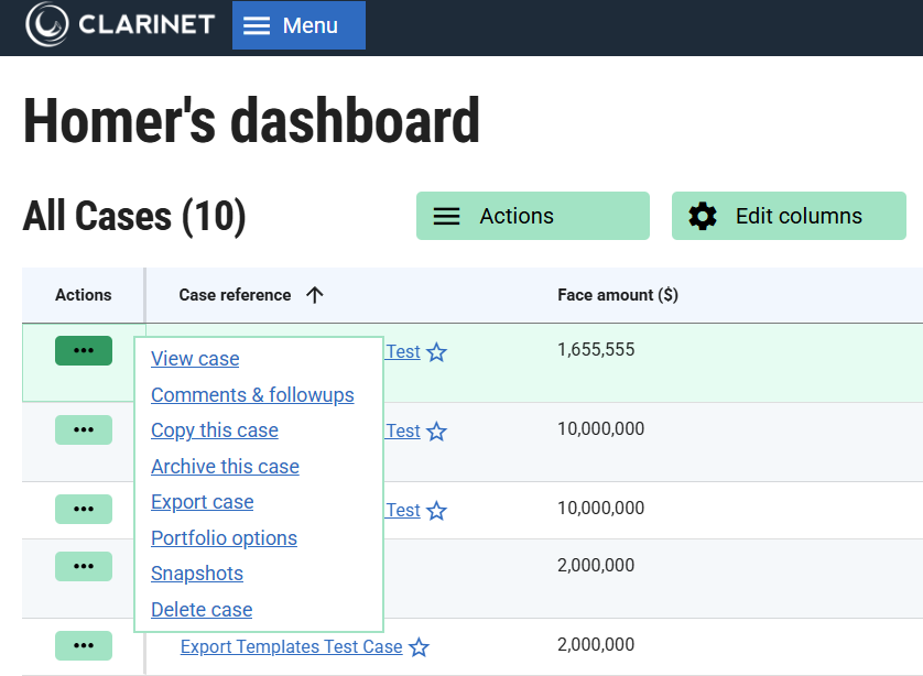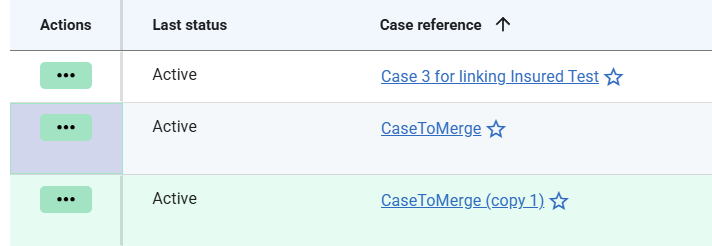 Each Case List also contains an actions column at the left hand side of the table. You can interact with the Cases in a Case List using the menu items that appear on clicking the actions menu: