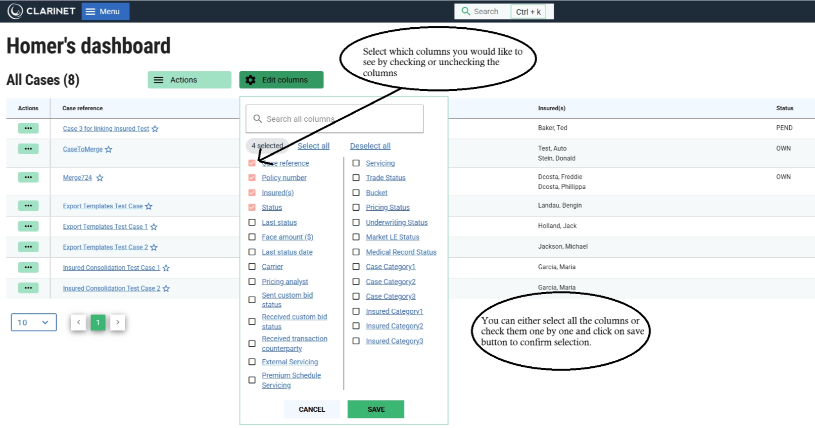 You can add the results of an Entity View as a Case list to the Homepage. When you create a new Case List, the layout of the default Case List is applied which you can then customize by selecting different columns, resizing, reordering and pinning as described above. This allows each user to display Case Lists on their Homepage using their own customizations.