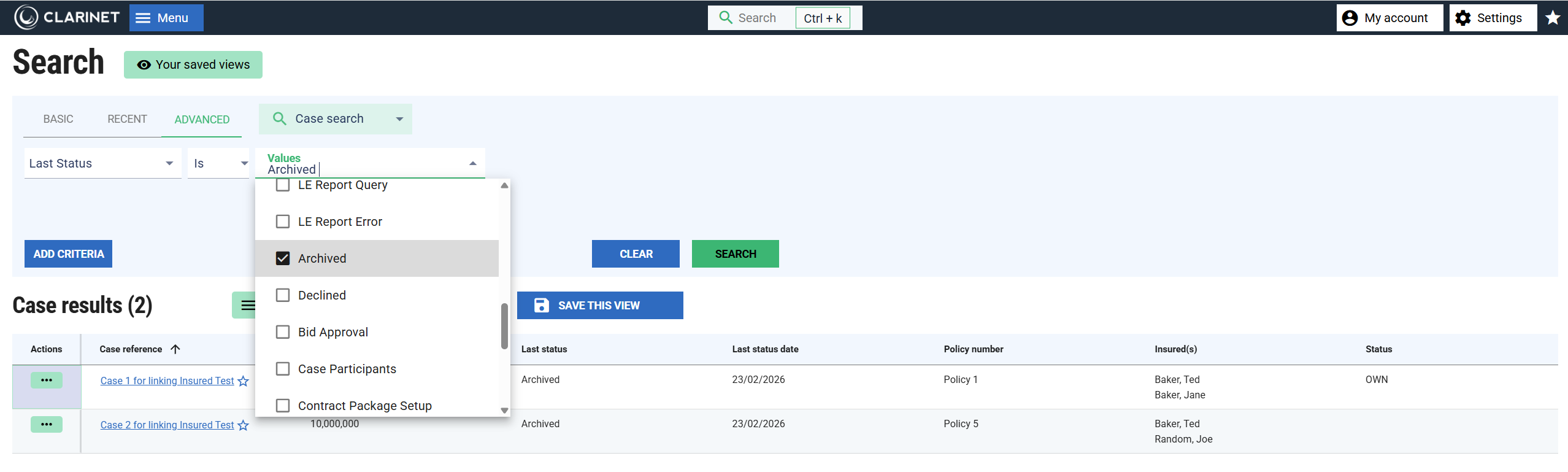 To view archived cases, use the Last Status Search Criteria on the Advanced Search page as shown below.