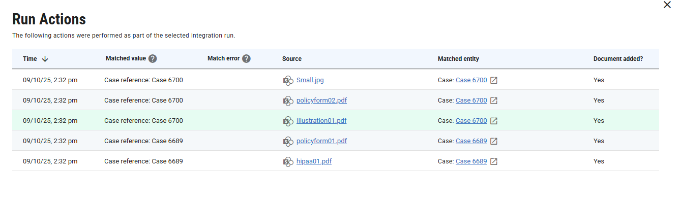 - Document Added Indicates whether the matched file was uploaded as a document. If the match was successful and the run was not a dry run, this will show Yes.