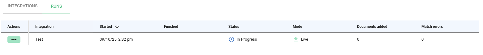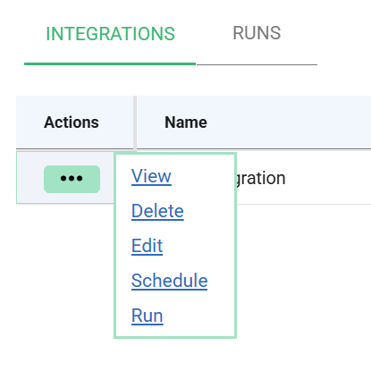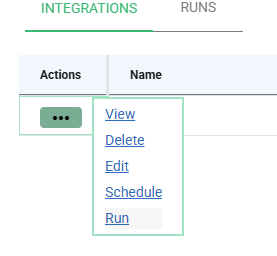 To run a specific integration, click on the actions menu for that integration in the table as below. You’ll be able to see “Run” as long as: