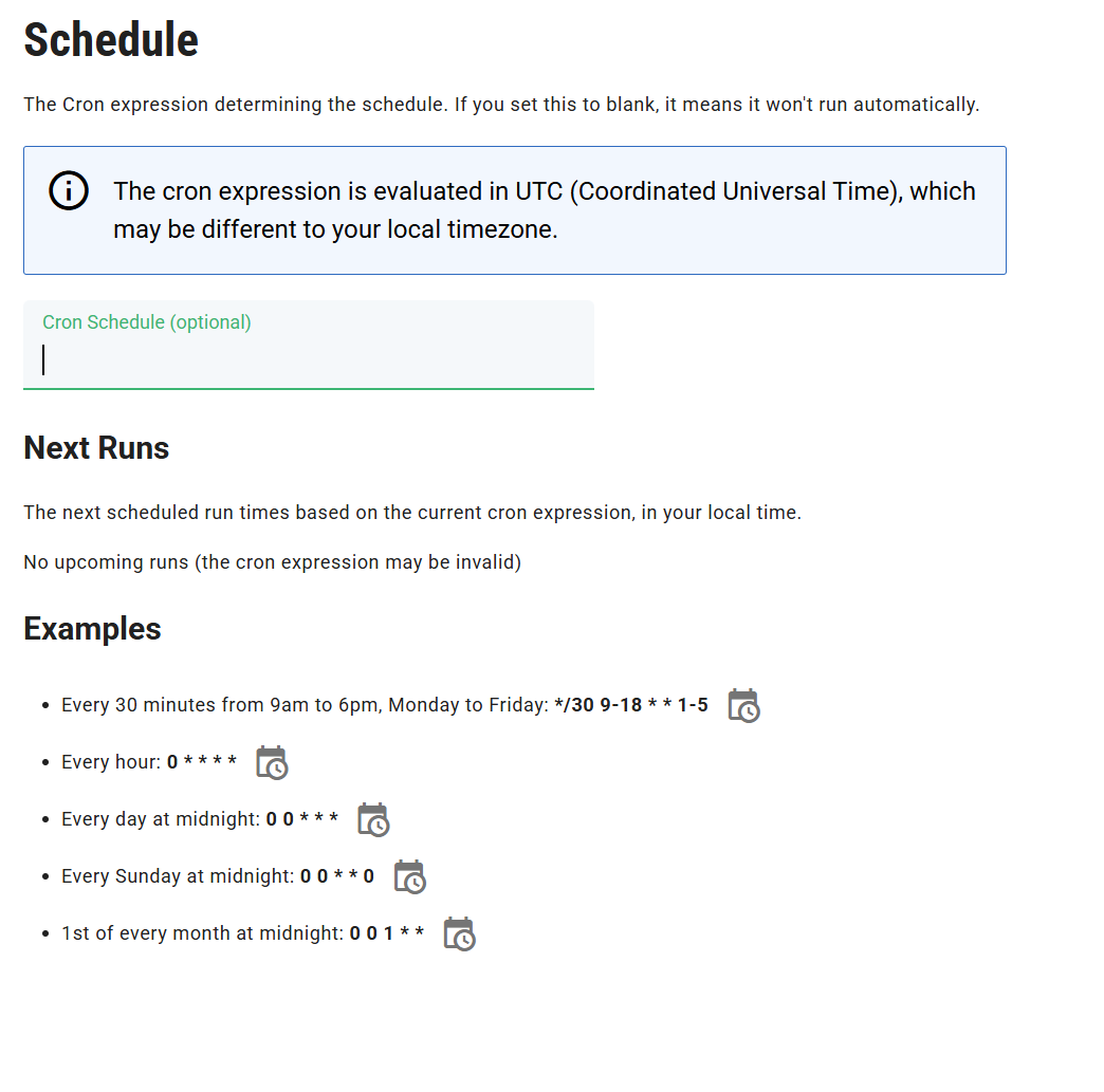 AI tools occasionally make mistakes. Once you’ve entered the Cron expression into ClariNet, a list of the next run times using that expression will be given to you in your local time , so you’ll be able to verify that it matches your expectations.