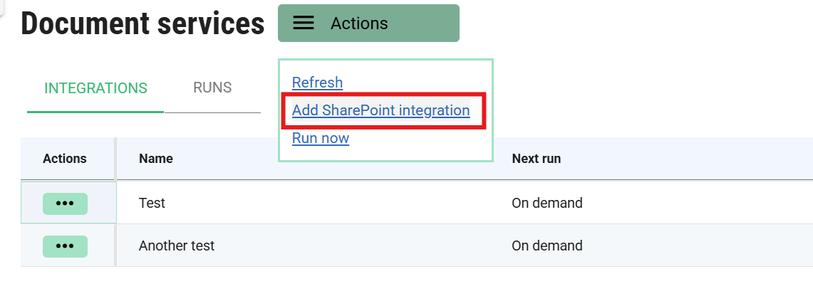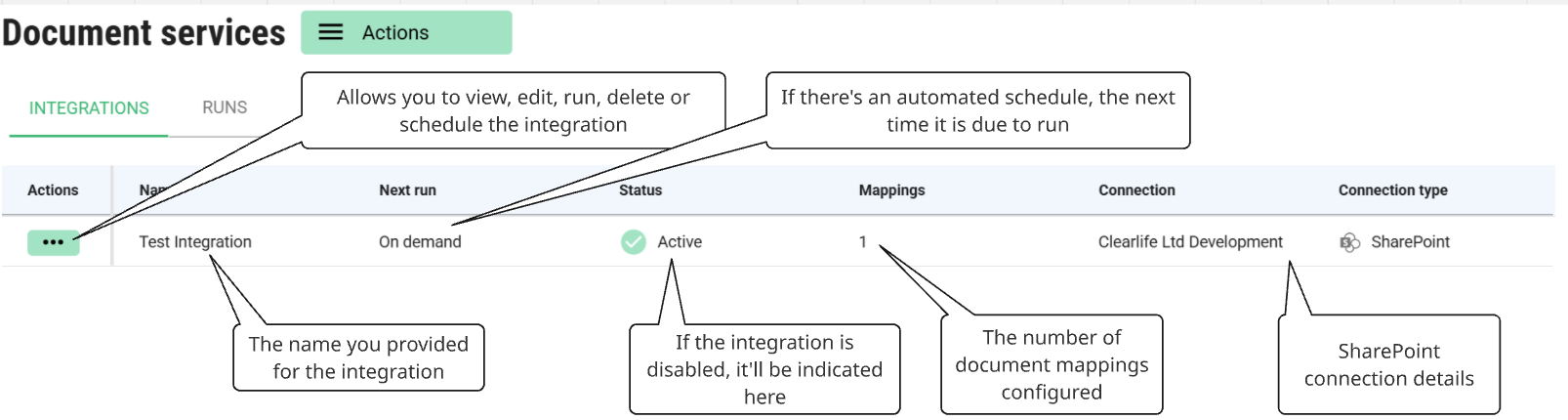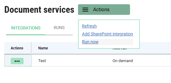 If you wish to run all the integrations for a Portfolio, assuming you have multiple defined, then you can do so from the “Actions” button at the top of the Document service tab: