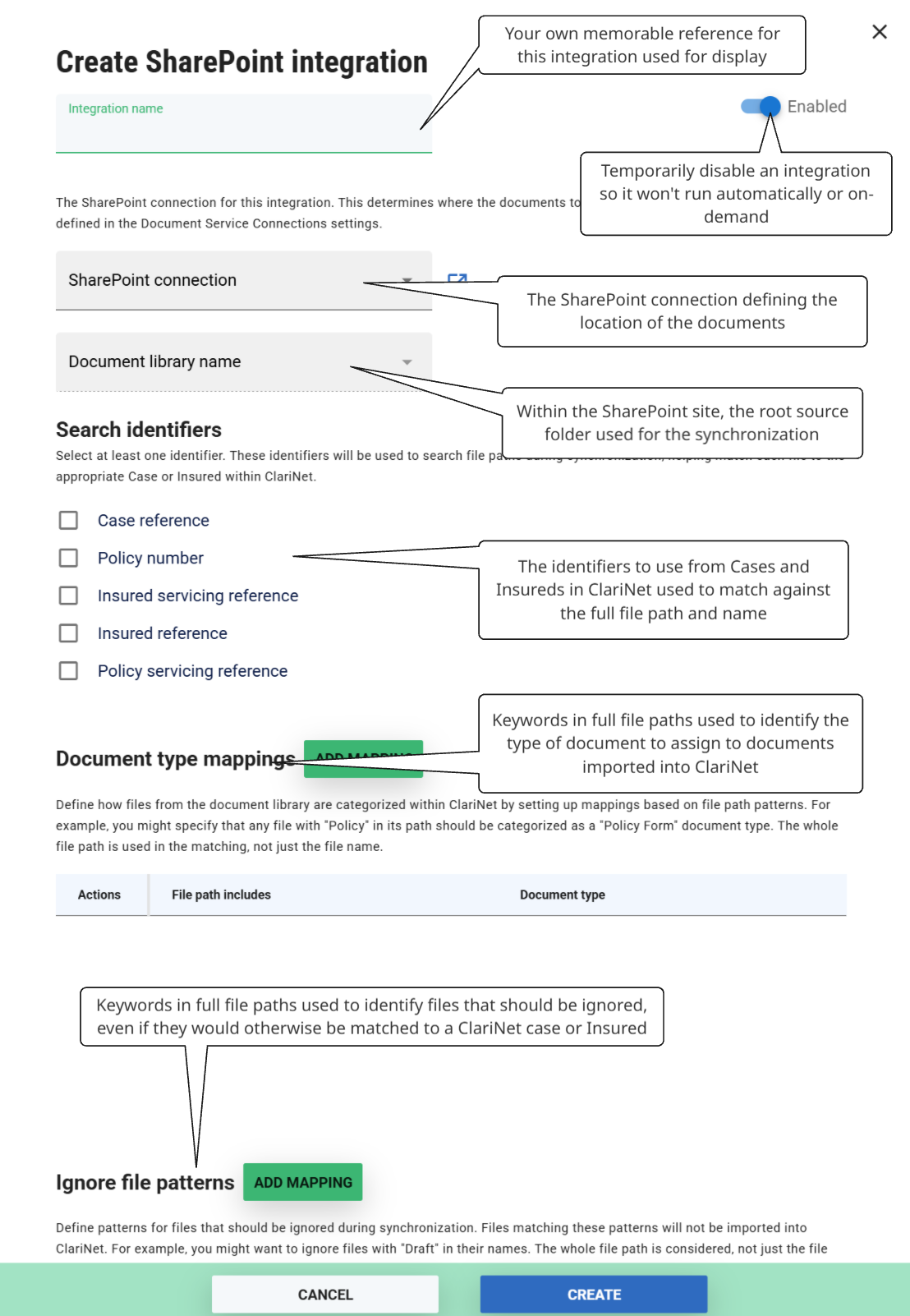 A document service integration defines how ClariNet matches files from your document source to the correct Cases and Insureds within a Portfolio.