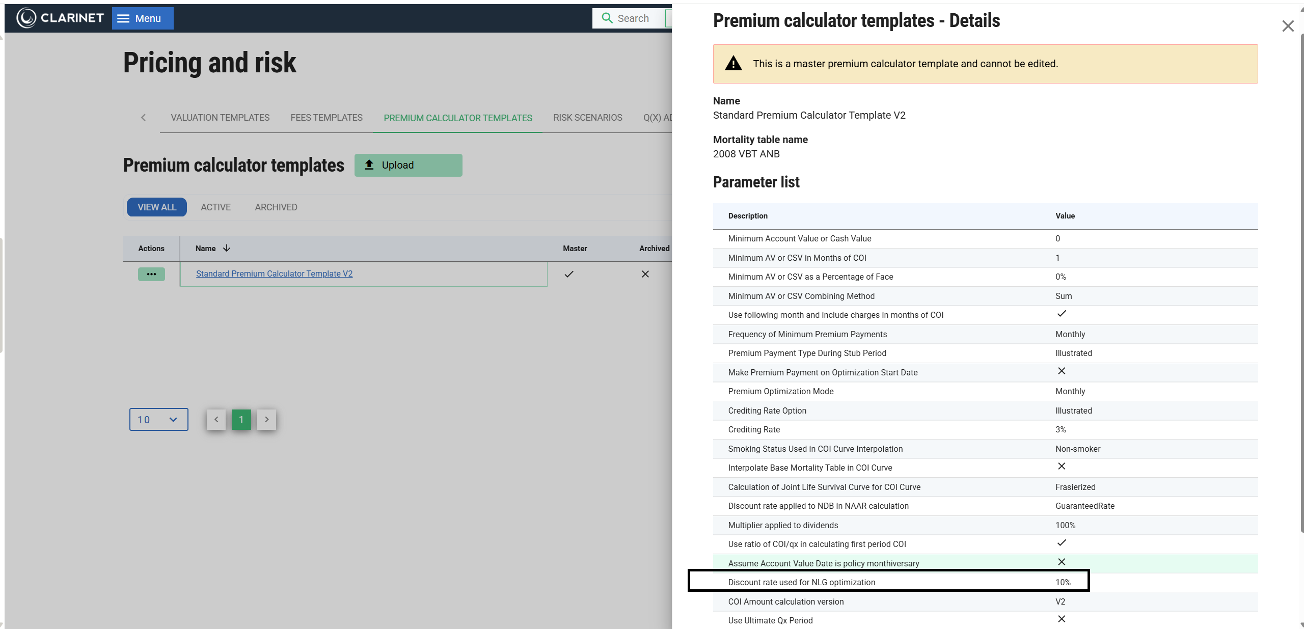 The parameter "Discount rate used for NLG optimization" determines the discount rate used in optimizing the duration for which no-lape premiums are paid. This is relevant only if the No Lapse Guarantee Payment Type is set to "Optimal" in the Premium Calculator. If this is selected, the solver tries to determine if the catch-up payment that might be required at the end of the no-lapse guarantee period is worth the lower premiums that are paid during the no-lapse period. It does this by calculating the point in time at which switching from the no-lapse premiums to making payments based on COI results in the lowest present value for the Premium Schedule.