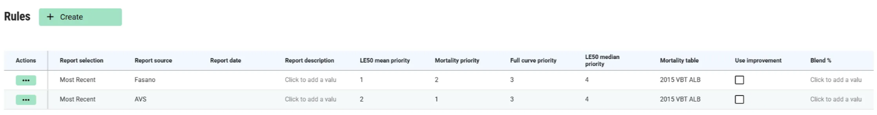 This follows the blending rules from the Valuation Settings tab at Case level, with some enhancements. Rules can be added to the table by clicking the Add icon at the top of the table. The rules are then applied to each Case in the Portfolio based on their order in the table (which can be adjusted using the arrows in the Move column). In the example above, the most recent report from AVS is used first – if that is not available, the most recent report from Fasano is used. Note that in this example, no value is selected in the Blend column – if a value is entered in the Blend column, then each LE Report with a Blend is selected together (rather than following the order in the table).