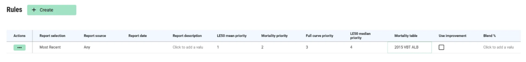The text boxes for LE50 Mean, Mortality Factor, Full Curve and LE50 Median determine which data point is used from the LE Report, in the specified order of priority. Only boxes that have a value are considered for selection (e.g., if you leave Full Curve blank that data point from the report will never be used).