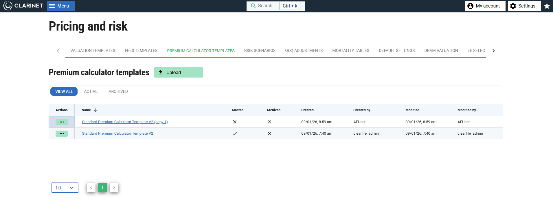 Clicking on the Pricing & risk menu item opens the page. Select the Premium Calculator Templates tab: