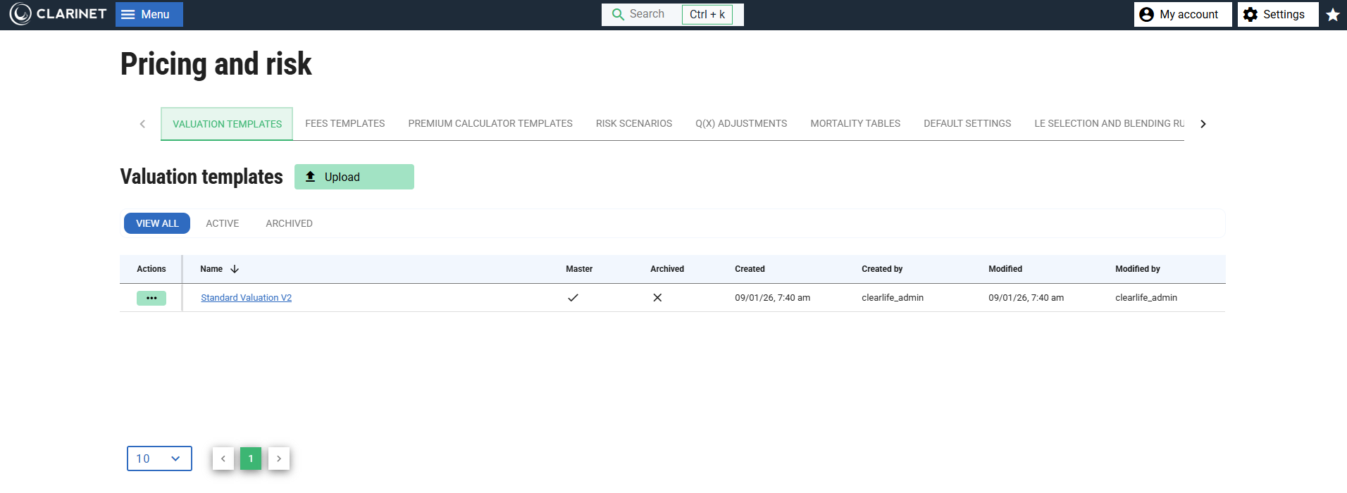 Clicking on the Pricing & risk link opens the page, with the first tab “Valuation Templates” visible: