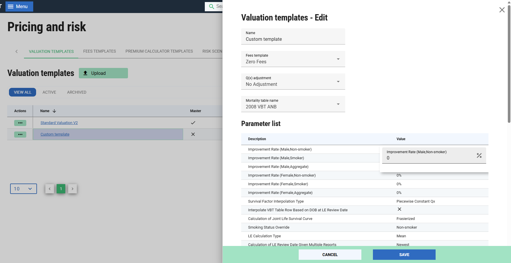 The ClariNet LS pricing model uses a set of assumptions described as a “Valuation Template” to determine how to build survival curves, blend LE Reports and carry out various other calculations relevant to pricing and risk analysis. When your ClariNet LS account is created, it comes with a default Valuation Template, labelled “Standard Valuation Template”. This document is a guide to creating and editing Valuation Templates.