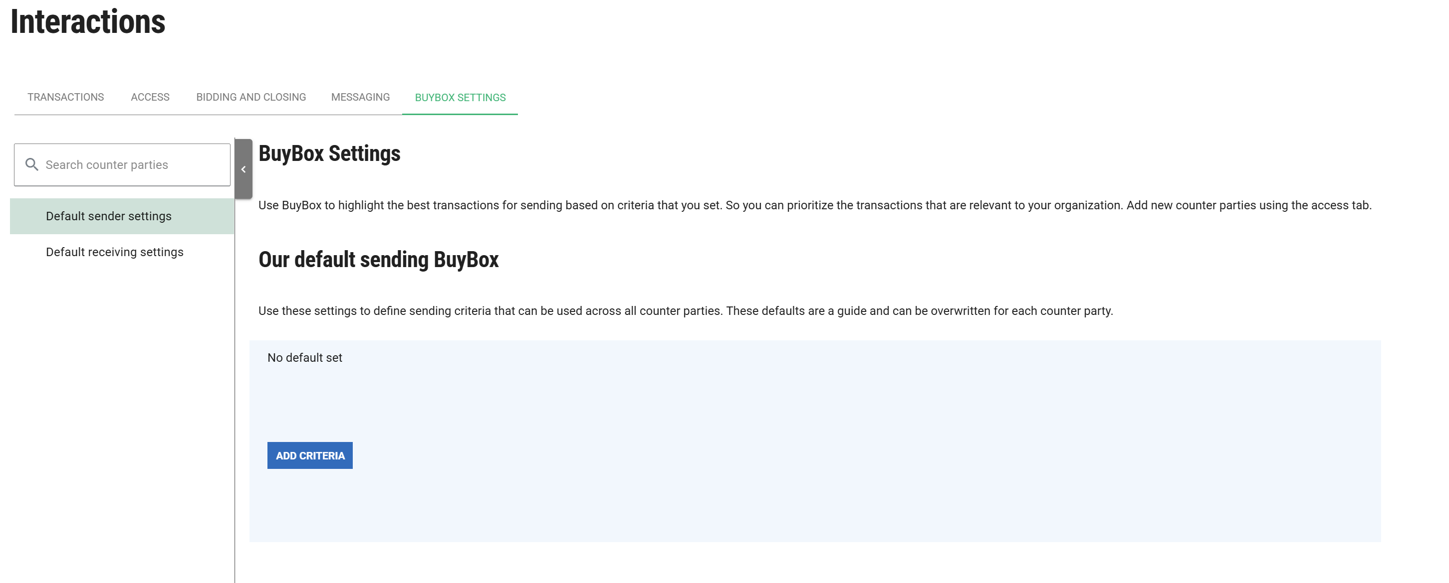 Users with the “Buy Box” role, in the essentials module can configure a BuyBox per counterparty for sending and receiving cases. Users without the role can only set up one set of defaults for receiving cases.